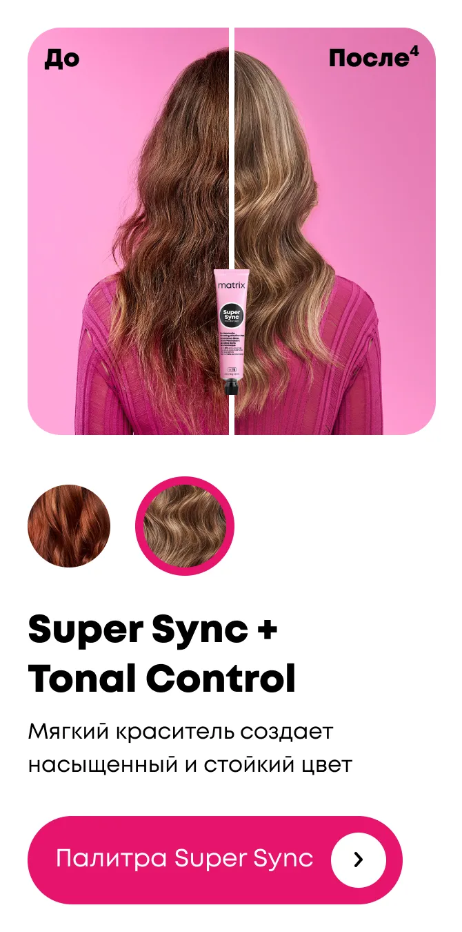 Палитра оттенков и визуальные примеры: представили 9 оттенков Super Sync и их результат на различных типах волос, демонстрируя возможности для создания стойкого цвета с улучшенной текстурой.